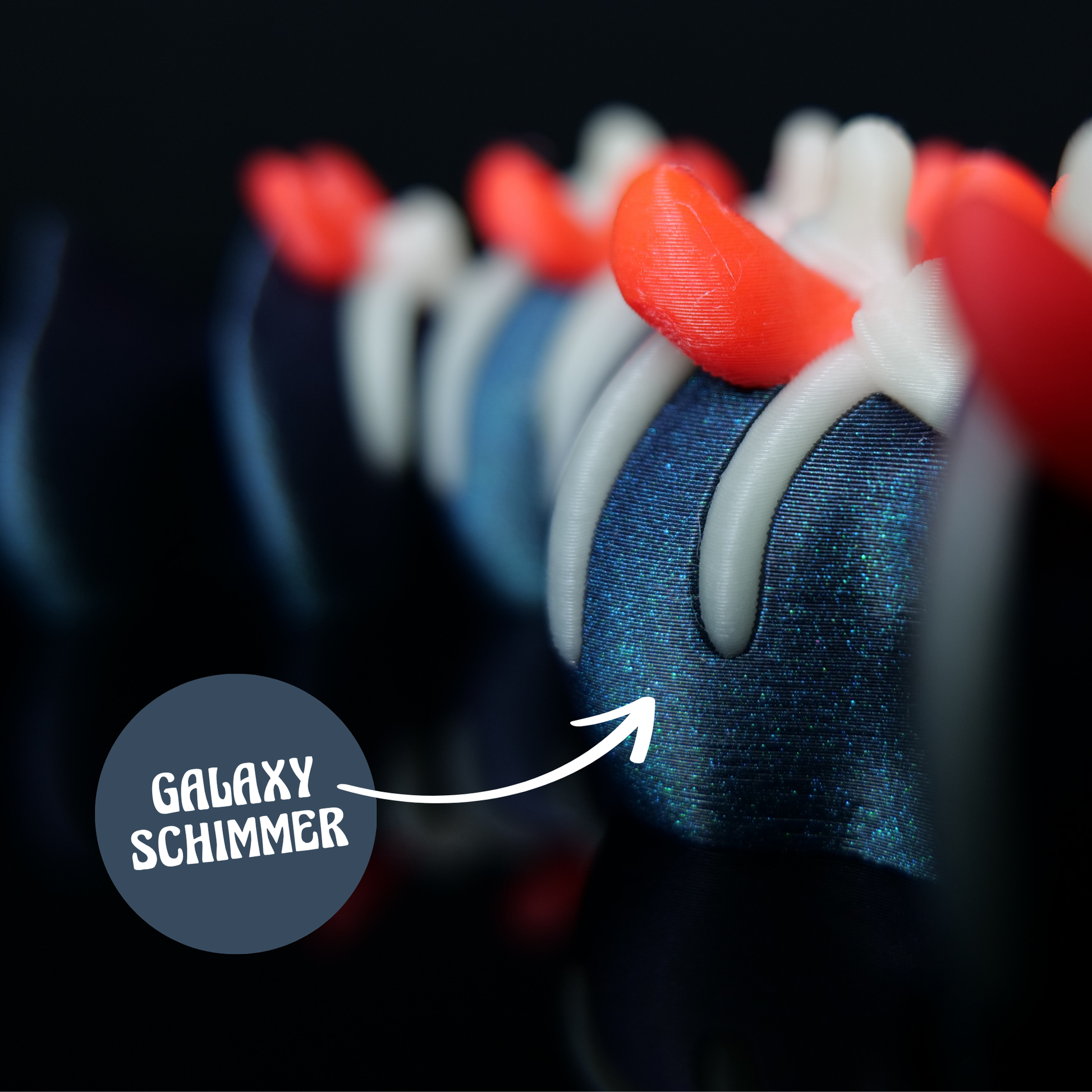 Sein schimmernder Körper aus Galaxy-Filament erinnert an einen funkelnden Sternenhimmel, während die grünen Knochen-Elemente im Dunkeln unheimlich leuchten.